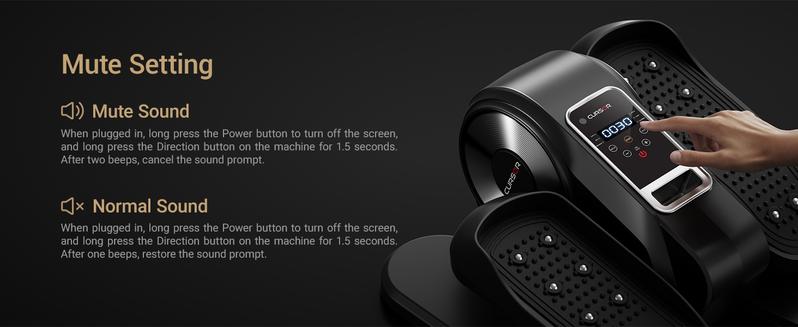 - Mute Setting: CURSOR elliptical equipped with the latest mute system, which ensures a ultra quiet workout without disturbing your colleague or baby sleeping even at a high speed. When plugged in, long press the Power button to turn off the screen, and long press the Direction button on the machine for 1.5 seconds. After two beeps, cancel the sound prompt, and follow the same steps to restore normal sound